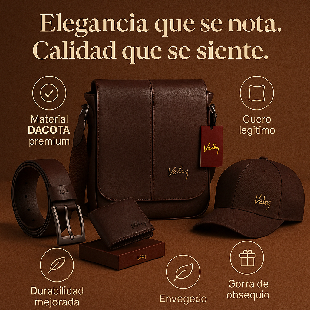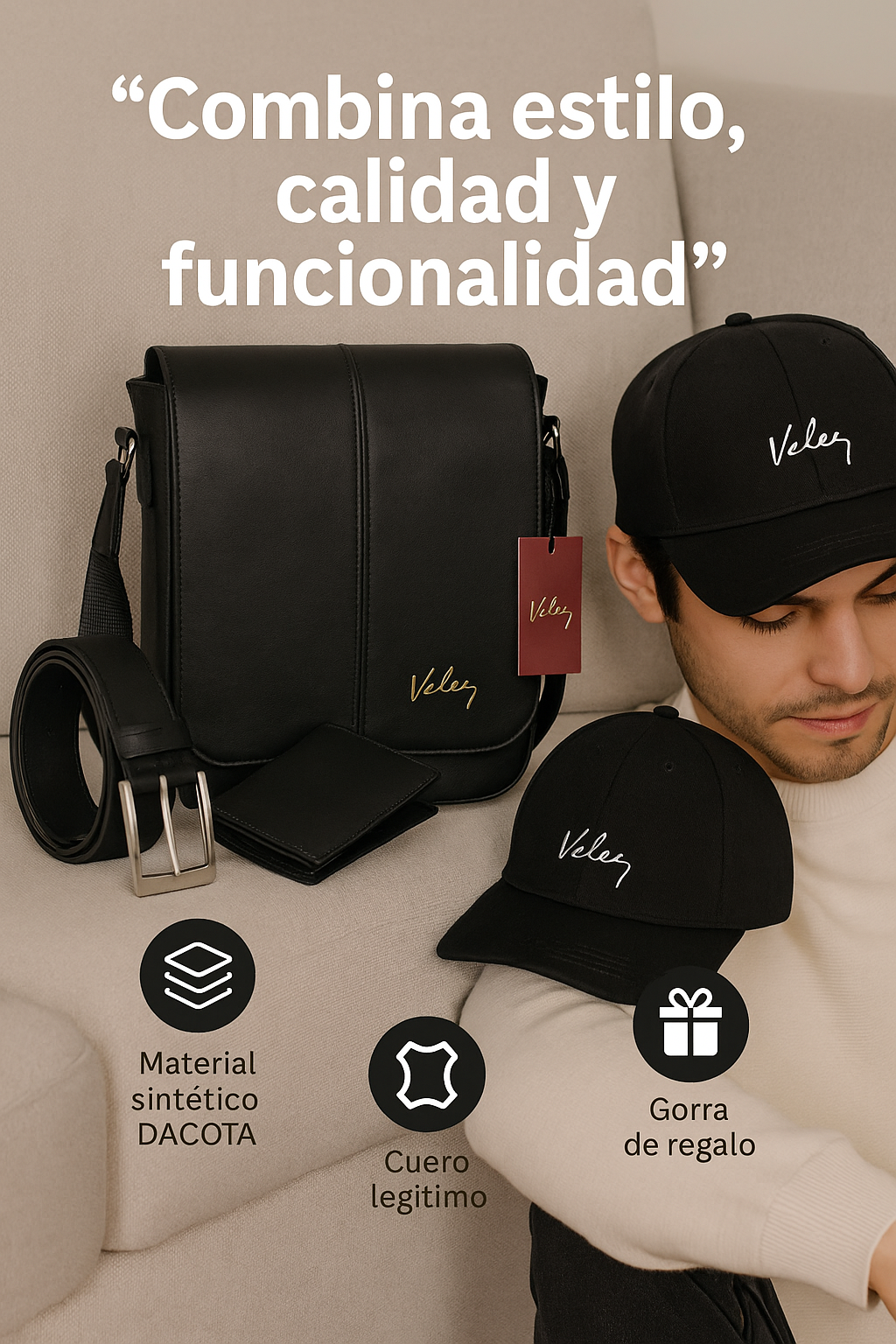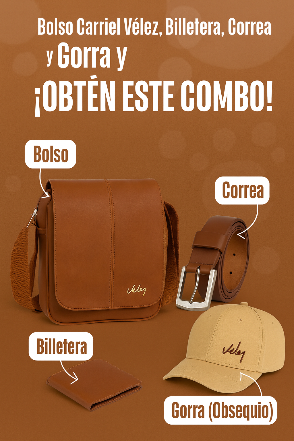 EL COMBO VELEZ QUE TODO HOMBRE NECESITA, TE INCLUYE: (1.BOLSO TAPA LARGA, 2. BILLETERA, 3. CORREA Y COMO OBSEQUIO OBTÉN UNA MARAVILLOSA 4.GORRA VÉLEZ.🧢👜