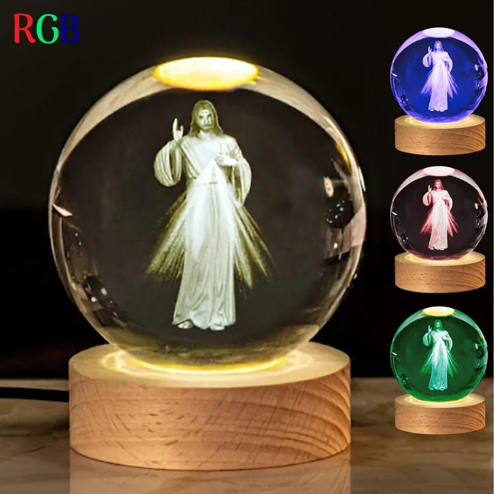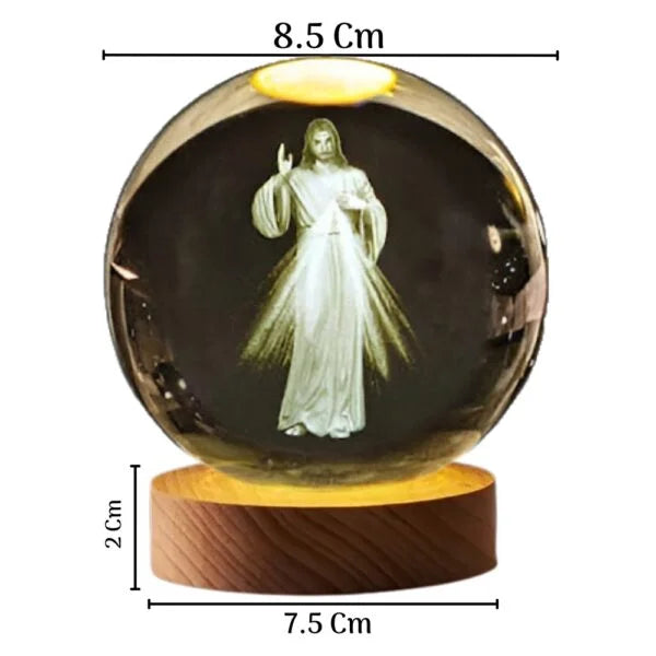 La base es de madera, la figura en resina y la esfera en cristal.